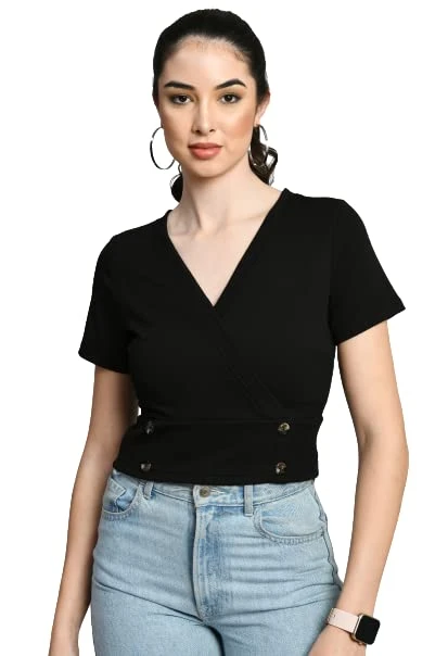Black Short Sleeve Wrap Crop Top -YQV3WA