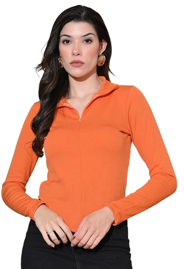 Orange Ribbed Zip Collar Long Sleeve Top -HSF7WU