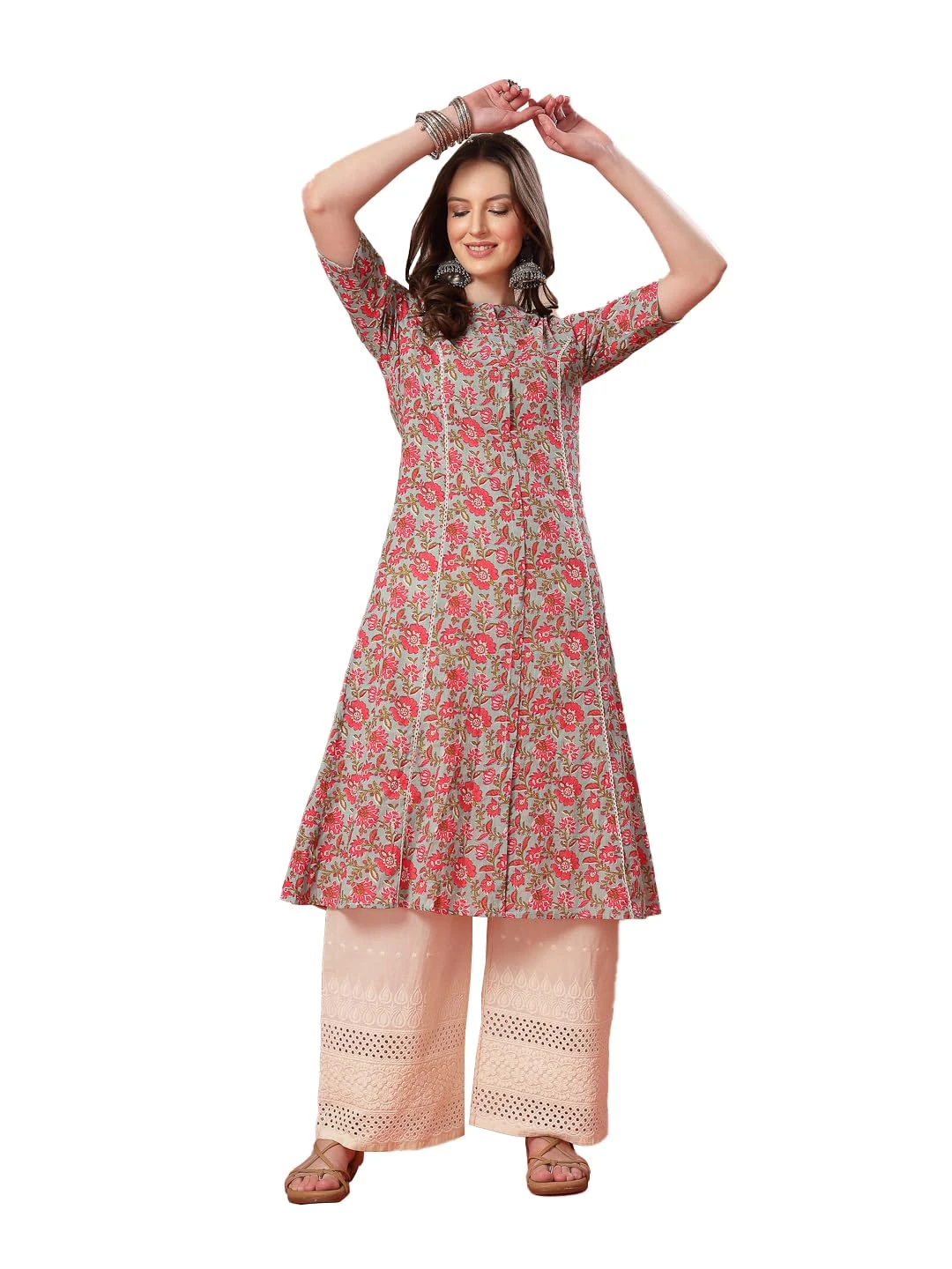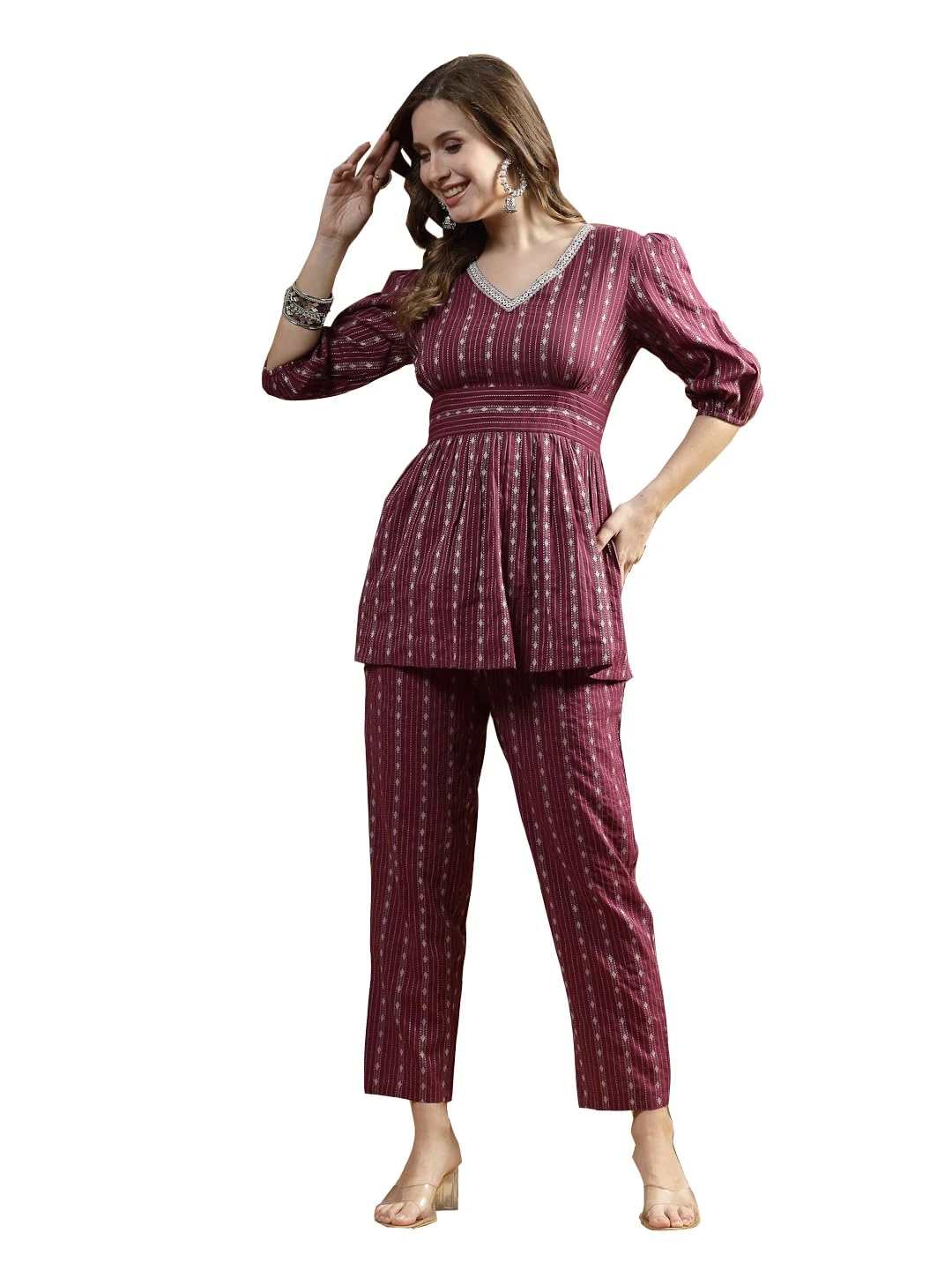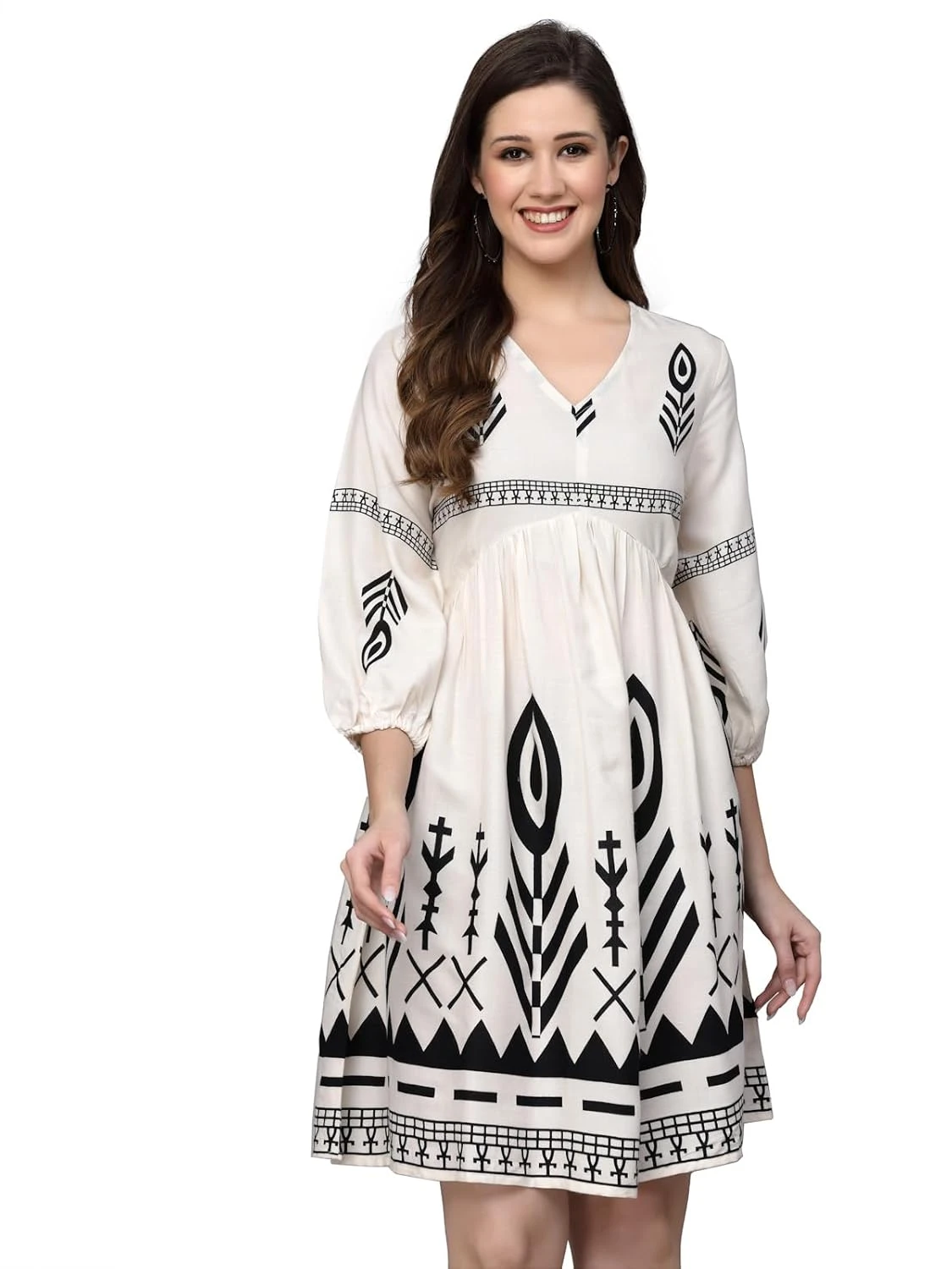 Smart and comfortable blue printed top made from pure cotton, featuring ethnic and abstract prints throughout. Designed with a round neck, keyhole detail, and 3/4th puff sleeves with elasticated cuffs for a trendy look. Ideal for daily wear, office, or casual outings—pairs perfectly with jeans, trousers, or ethnic bottoms for a stylish appearance.
