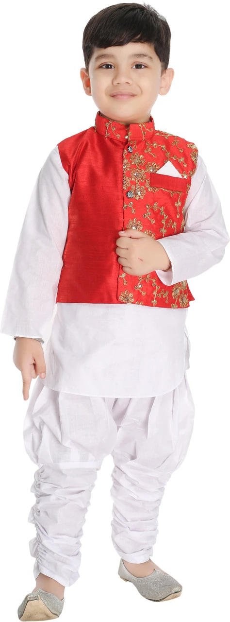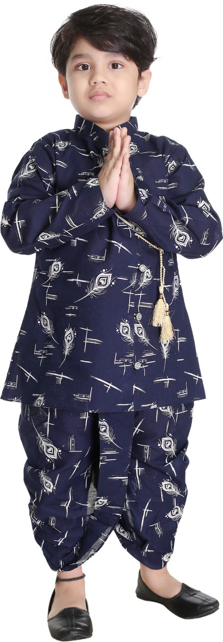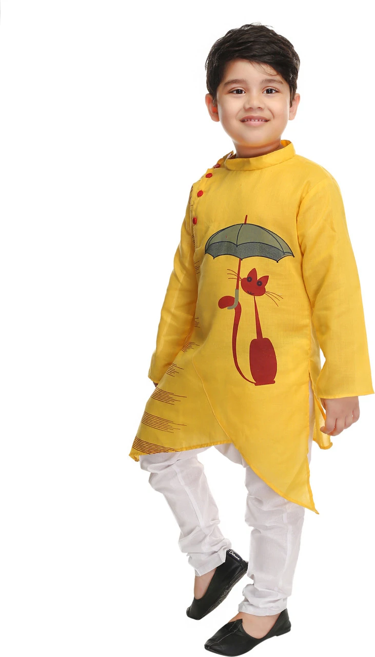 This festive dhoti kurta set for boys features a white kurta accented with vibrant yellow and blue floral prints, complemented by standout yellow cuffs, collar, and a matching yellow dhoti with golden border detail. The asymmetrical button styling and matching stole/pocket square add a royal touch, making it ideal for weddings, festivals, and traditional celebrations.